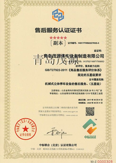 為了促進(jìn)停車(chē)行業(yè)售后服務(wù)的發(fā)展進(jìn)步,我公司自投資金引進(jìn)第三方管理體系公司,完善我公司的售后服務(wù)體系,并成功的取得了五星級(jí)售后服務(wù)管理體系認(rèn)證證書(shū)。