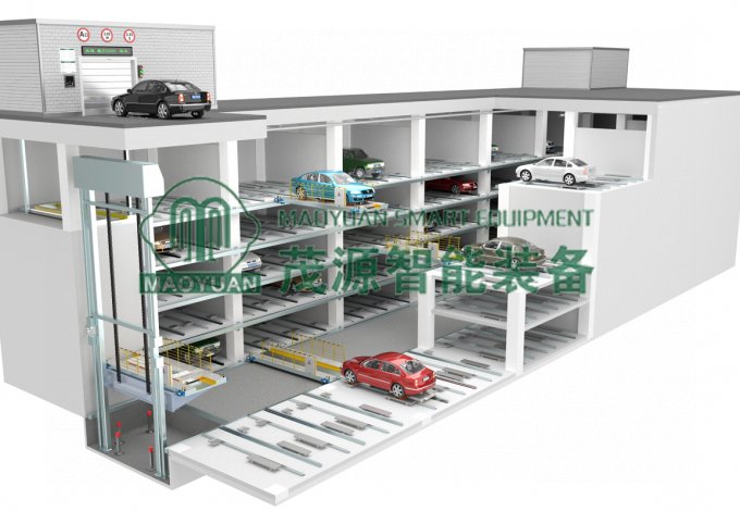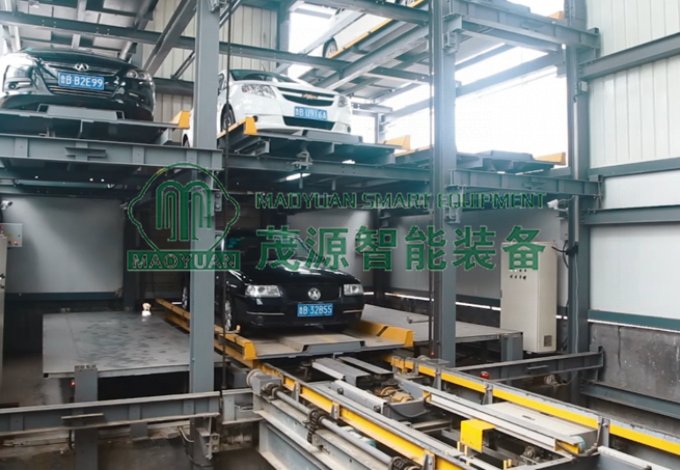 此類設備由出入口、對中系統(tǒng)、回轉系統(tǒng)(根據項目需求設計)、升降機、摩擦臂式搬運臺車、載車板、設備主體(混凝土/鋼結構)、安全裝置和控制系統(tǒng)幾部分組成。